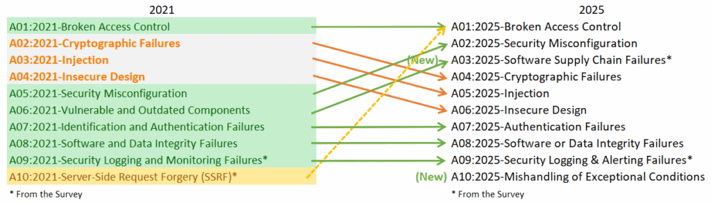 - Le contenu de la catégorie A10:2021 – Server-Side Request Forgery (SSRF) a été inclu dans la catégorie A01:2025 – Broken Access Control ;